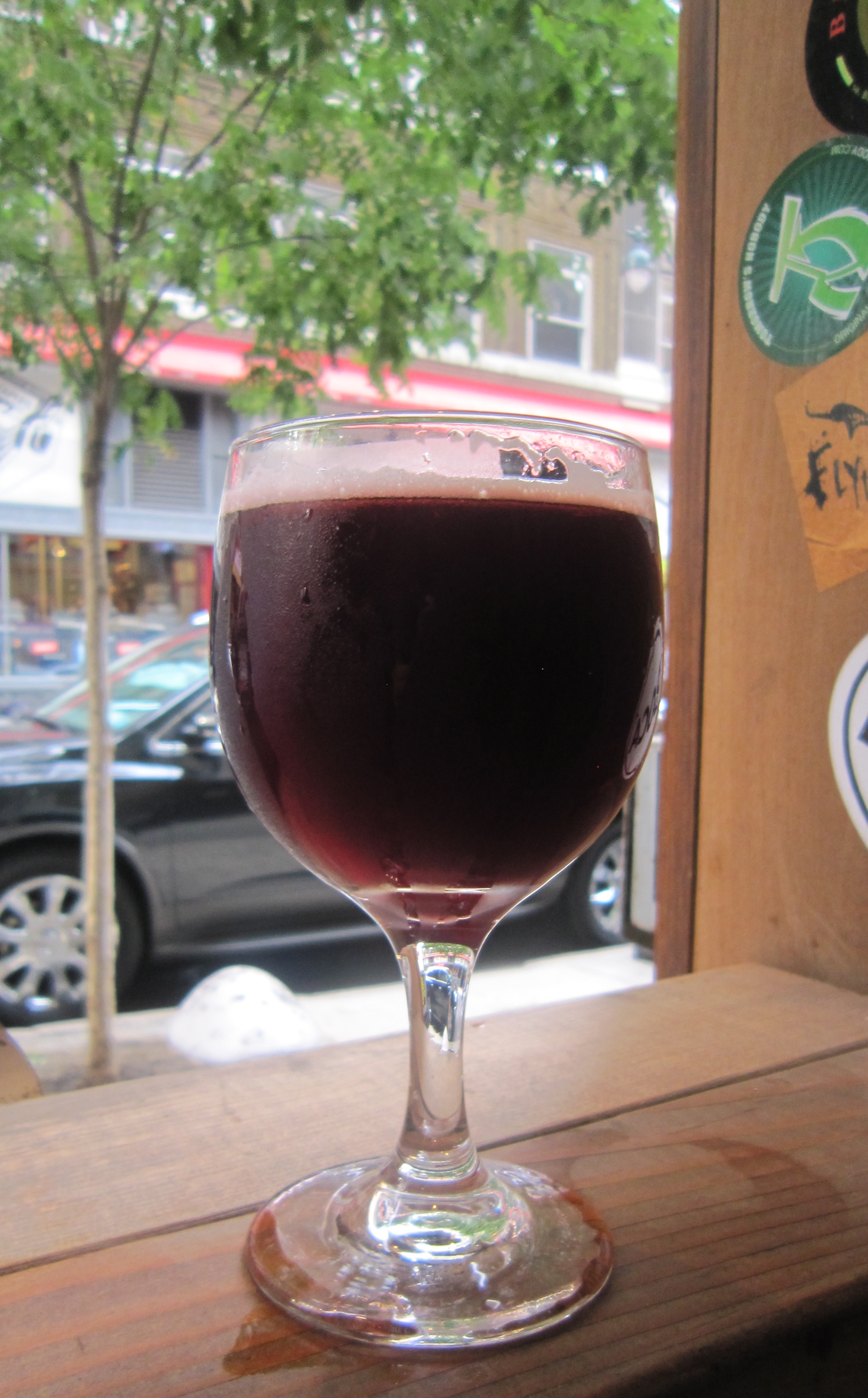 Upon receiving my 8oz pour of KBS I went back to my seat at the front of the bar, and though I was tempted to dig in right away, I took a moment to admire the beer’s appearance. As I remembered it, this bourbon barrel aged imperial stout (11.2% ABV) poured an opaque dark brown to black color with a 1/2 finger of light brown head. In addition, after tilting my glass back and forth a bit I could see a moderate amount of small bubbles and the beer clinging to my glass in the form of both head lacing and alcohol legs. Upon taking my first whiff I did the “oh yeah” head bob as I was drawn in by an inviting and complex aroma which included notes of milk and dark chocolate, bourbon, oak, espresso coffee, and a touch of toffee. At first the taste was a bit rough around the edges with some oak tannins and notes of the beer’s ABV. Though I did not mind them that much because my palate was also met with delicious milk chocolate, coffee, and vanilla.