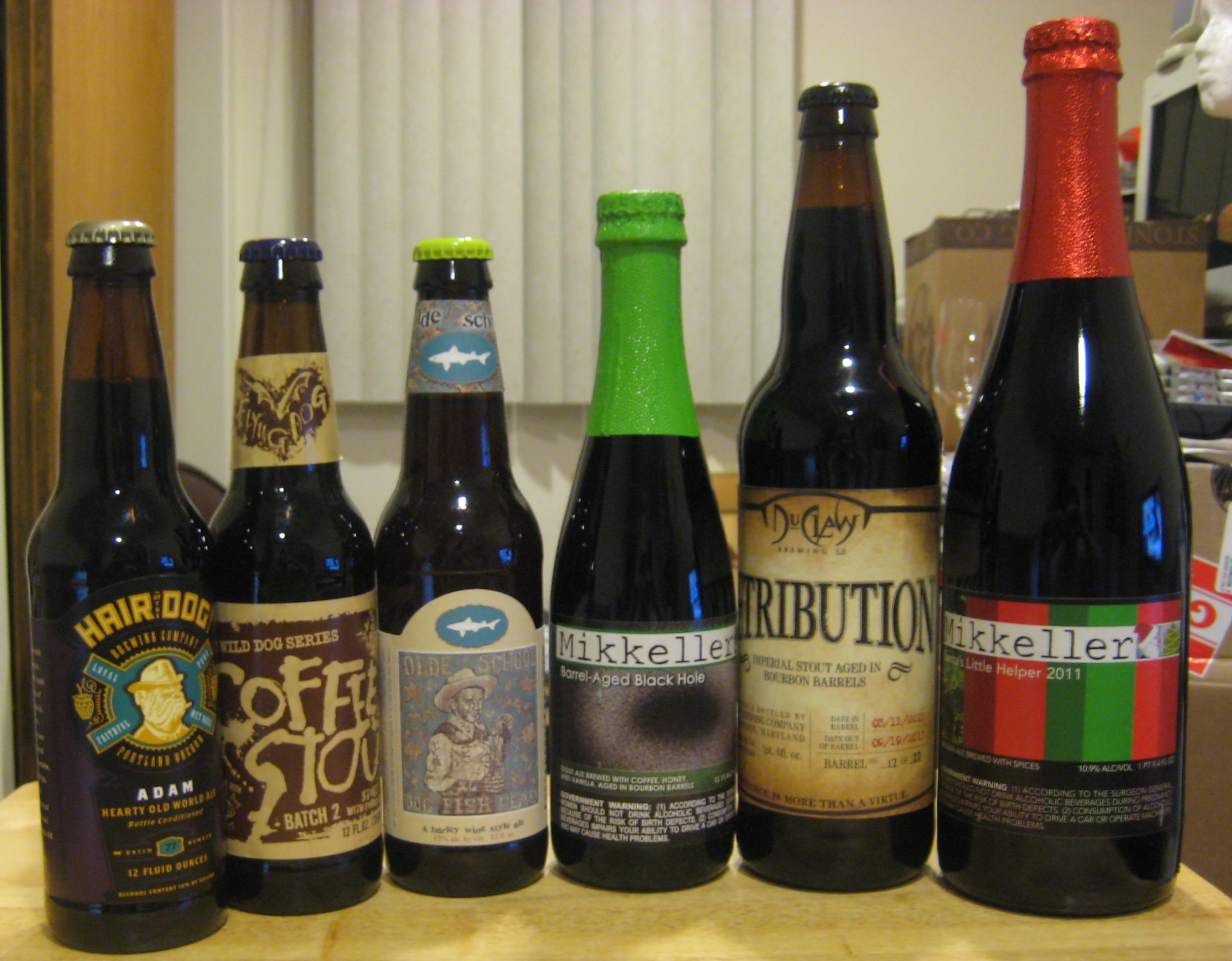 As my final beer of the night / this tasting I chose a big one i.e. Dogfish Head’s monster english barleywine. It poured a nice slightly cloudy copper color with some lacing and lots of alcohol legs. As with World Wide Stout the aroma and taste both had big fusel alcohol notes akin to nail polish remover. When those notes decreased a bit I was able to pick up some dark fruits such as cherries and plums, peach, apricot, some caramel and toffee sweetness. So while I did enjoy the presence of those flavors the fusel notes prevented me from finishing my 4oz pours (split the bottle 3 ways). I remember trying a 2009 vintage when it was 2 years old and it was amazing. So I guess 2010 wasn’t a good year for Olde School Barleywine. However, I should take this opportunity to say that Dogfish Head should learn from other breweries such as Avery Brewing Co. about what it takes to brew a successful huge beer (higher than 11% abv). Spending the money on beers this big that are hit and miss is a waste if you can’t prevent the huge fusel alcohol notes. Rating: 4/10