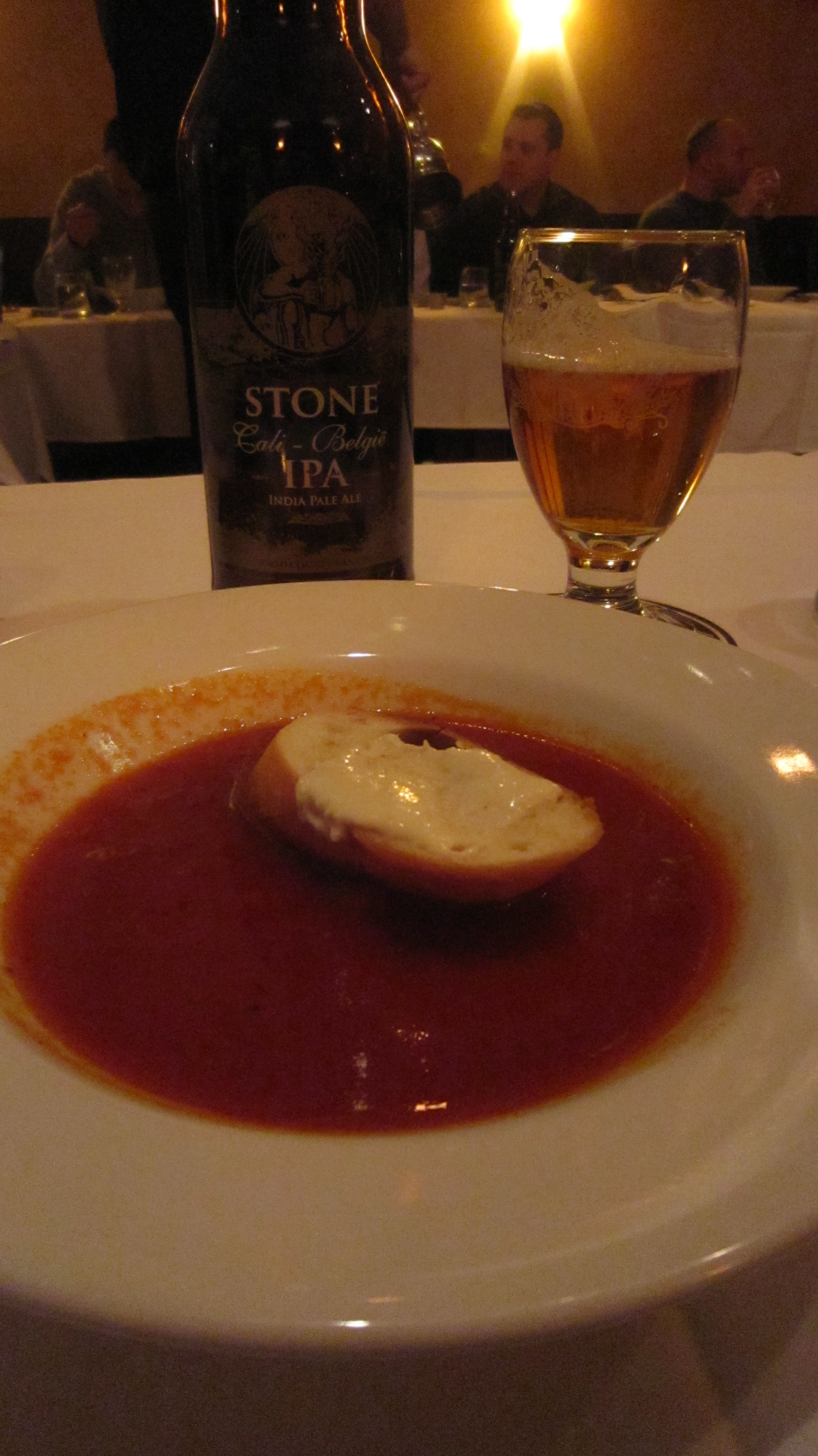 IMG_1496First Course: Zuppa de Pesce an italian boullebaise with garlic bread and a bronzini horseradish mousse Paired w/ Cali-Belgique IPA