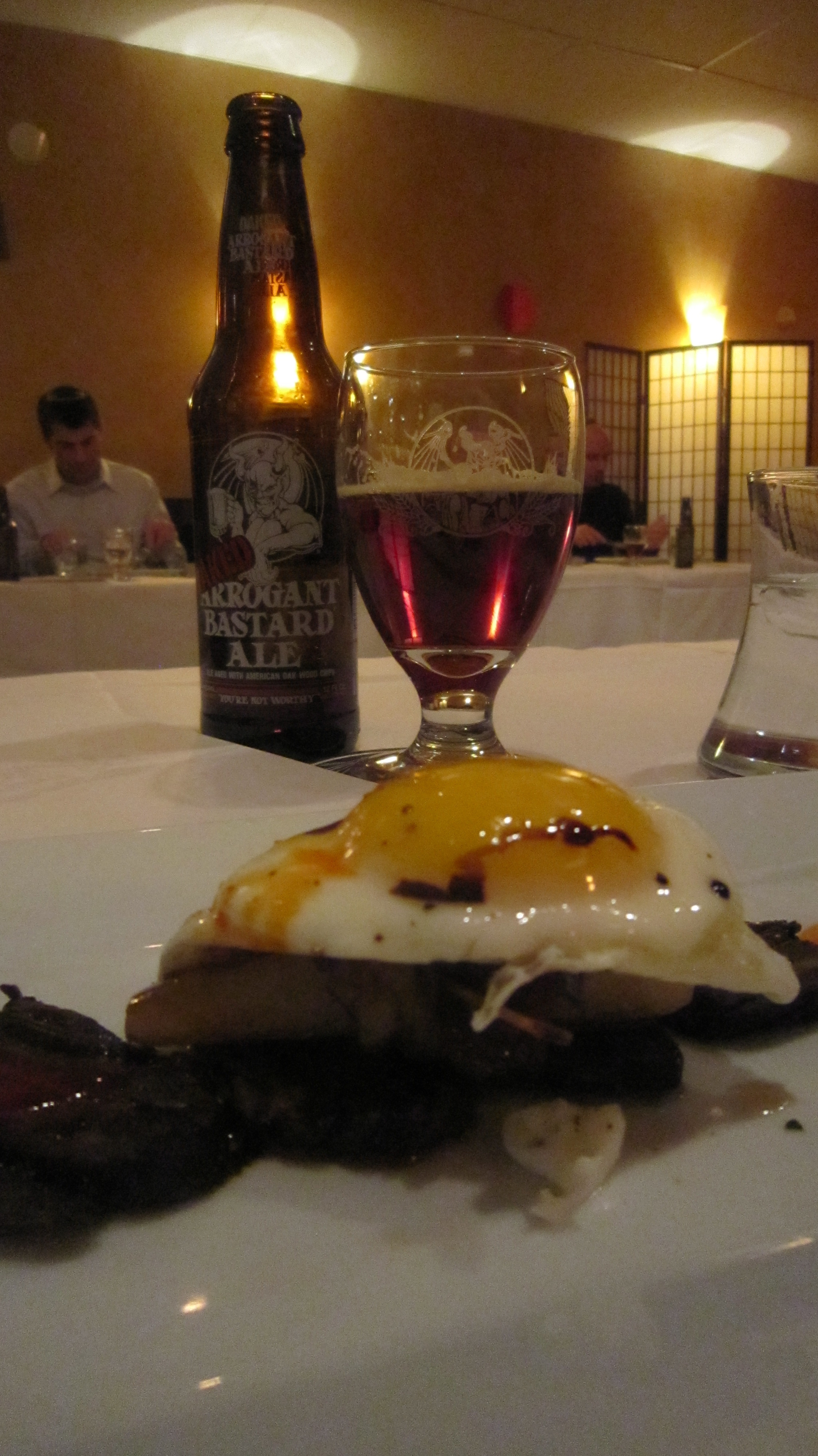 IMG_1503Second Course: Steak and an egg Beef carpaccio (hangar steak marinated in a balsamic vinegar reduction) with moscato poached pear, wrapped in lamb bacon and served with a runny fried egg Paired w/ OAKED Arrogant Bastard Ale