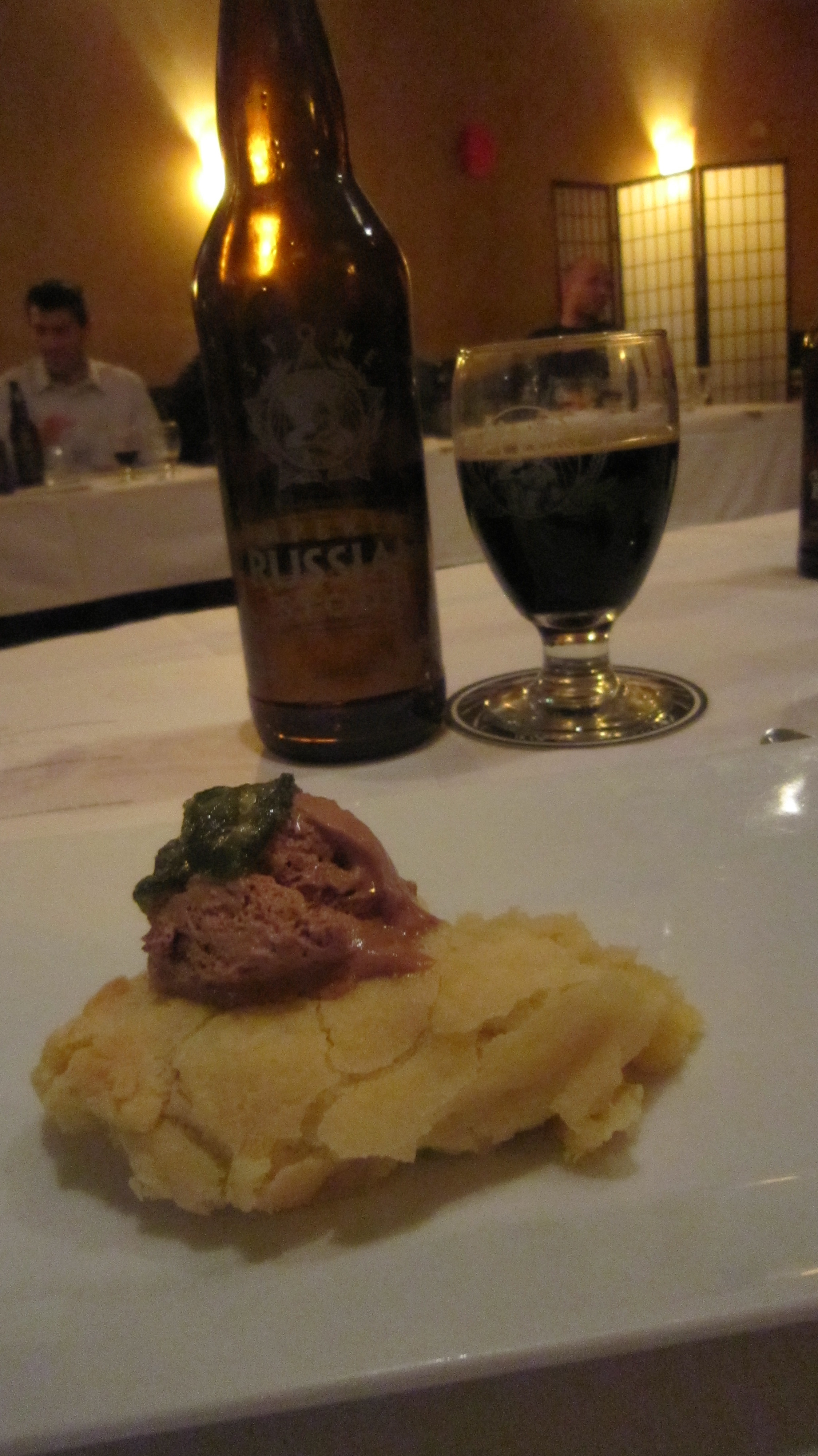 IMG_1509Course Four:  Chocolate Mousse Shortbread topped with a scoop of chocolate mousse and a candied jalapeno Paired w/ Imperial Russian Stout (2012)