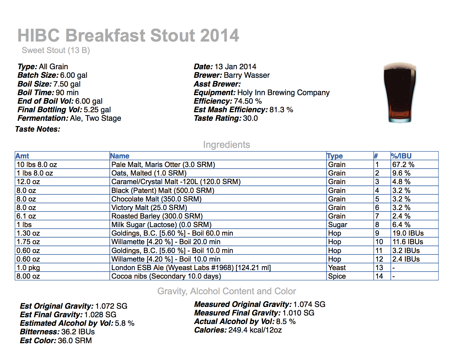 In October 2013 I brewed version 1 of this recipe as my first brew on my current equipment (10 gallon cooler mash tun and 10 gallon brew kettle) and enjoyed the finished product, but knew there was a fair amount of room for improvement. The first change that I knew I’d make when brewing it again was eliminating the cold pressed coffee. Doing so because after testing out a couple coffees with my final gravity sample of version 1 and choosing one that adding some great fruity notes to the beer I was bummed when none of those nuances were present after bottle conditioning. In place of the coffee I chose to cold steeping the darker malts (chocolate, black patent, and roasted barley) to prevent astringency and higher my chances of the beer having a coffee like aroma. Then I knew I’d be able to achieve a less estery aroma, by fermenting the beer in my fermentation fridge instead of using the “swamp cooler” method and choosing a yeast strain that only creates pronounced esters when fermenting over 70F (Wyeast 1968 London ESB instead of 1335 British Ale II). Lastly, I knew I wanted a creamier body and more chocolate flavor. So I chose to add lactose and buy an extra 4oz of cocoa nibs to accomplish those to things.