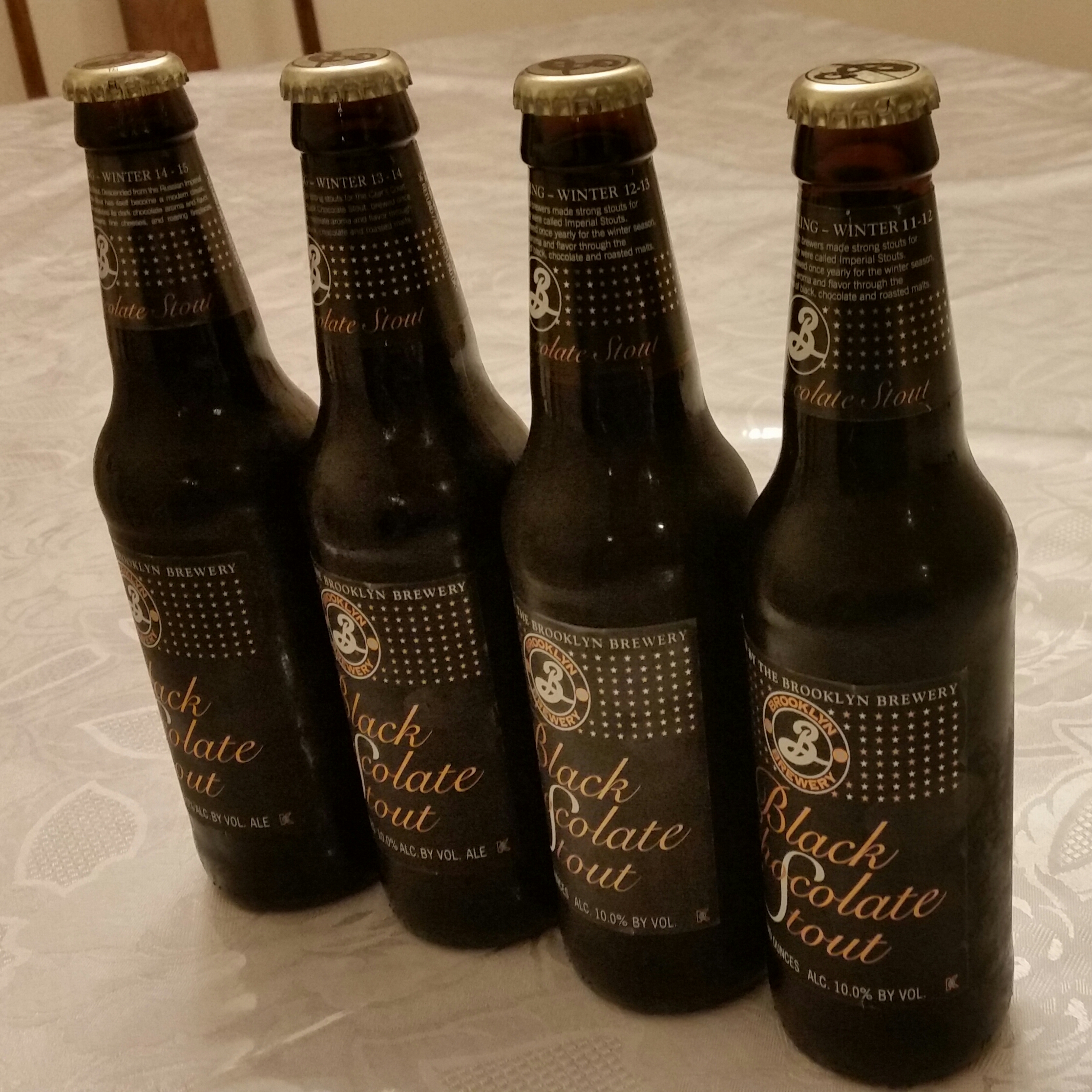 Ever since developing a taste for imperial stouts back in 2008 I’ve made sure to buy at least one four-pack of Brooklyn Brewery’s Black Chocolate Stout every year. Though for some reason I’ve only aged bottles for long enough to compare one year’s release to its immediate predecessor. So when my older brother told me that he recently organized his beer cellar and found Winter 2011-12 and 2012-13 bottles of Black Chocolate Stout I knew it was time or a vertical tasting spanning four vintages of this sought after beer.
