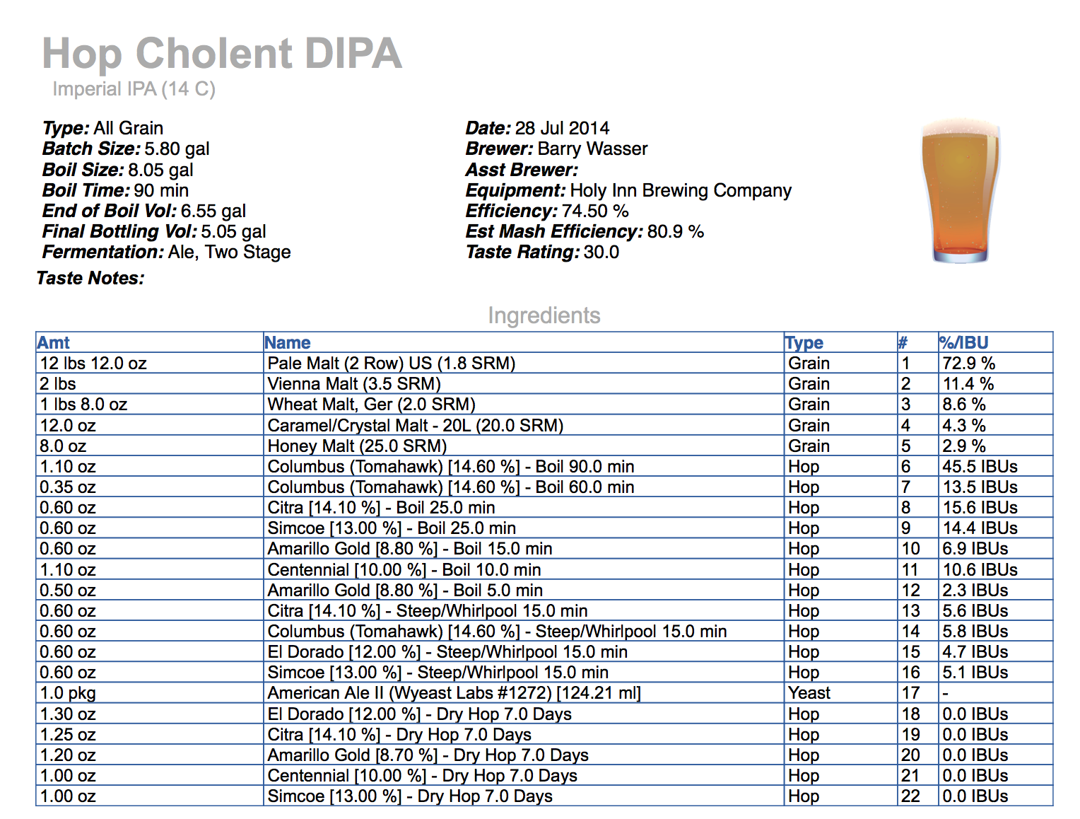 OG 1.080 Target FG 1.016 = 8.5% ABV, 130 IBUs