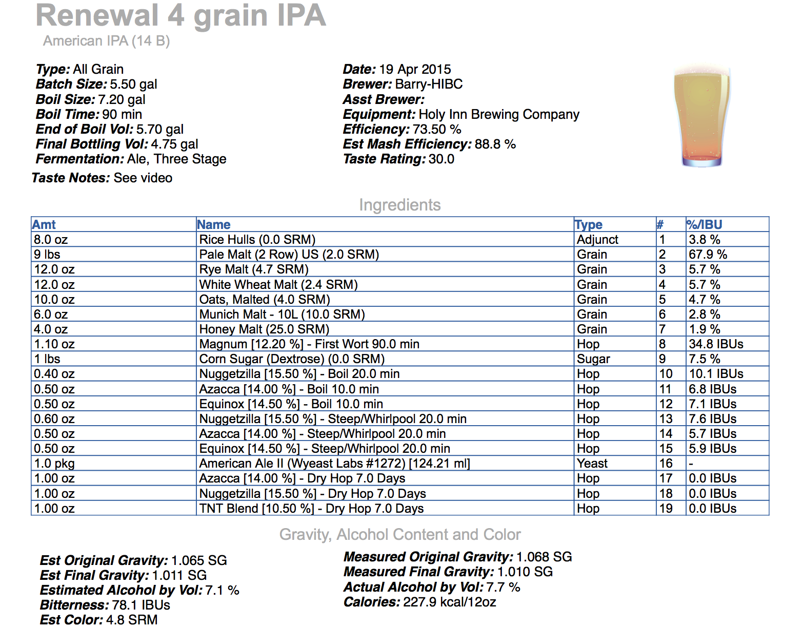 For my first “Grain To Glass” video I’ve chosen to share my latest innovative beer with you. Renewal Four-Grain IPA was brewed with barley, wheat, rye, and oats (purchased at Bitter & Esters) along with four relatively new hop varieties that were provided by Yakima Valley Hops. All in all I’m quite happy with the finished product, but you’ll have to watch this video to see how it was created. Below you’ll find some tips on recipe formulation that I gleamed from formulating and brewing Renewal IPA and the full recipe. Enjoy and Cheers!
