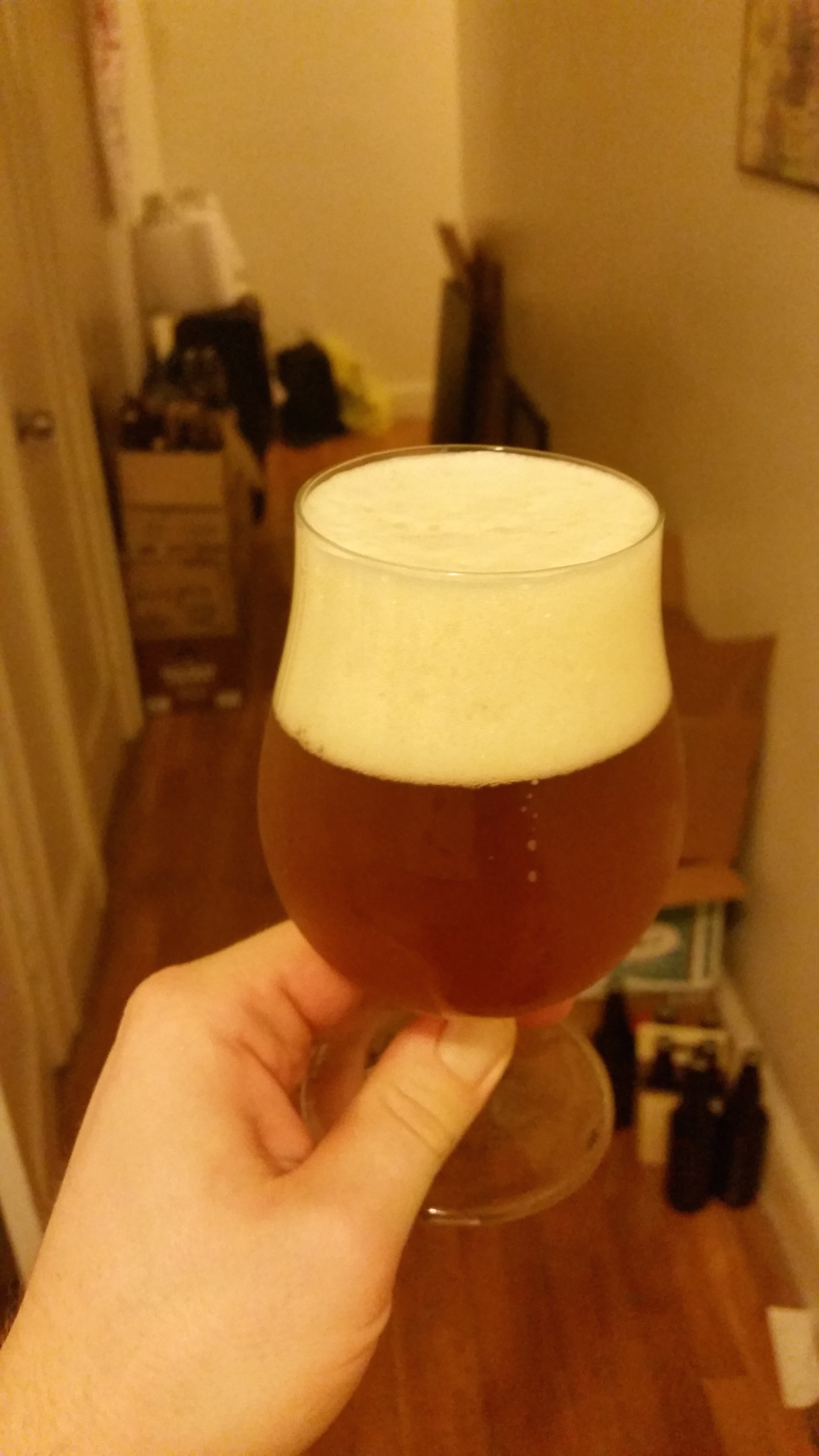 Mouthfeel: This first glass had a medium mouthfeel with a great smoothness and creaminess from the rye upfront and finished with just enough dryness/bitterness and rye bite. At times a picked up a touch of astringency, but it never became overwhelming. Despite being carbonated for three days at 30 PSI and one day at 10 PSI, I still feel that the beer needs a bit more time to fully carbonate. 4/5