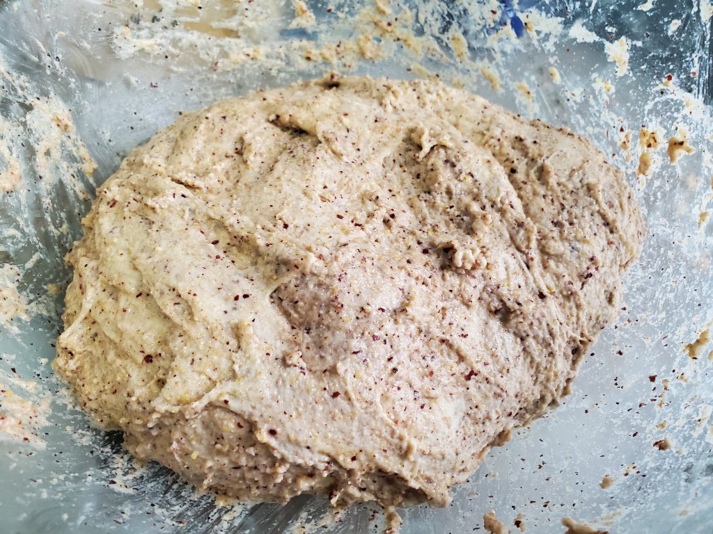 I used my Mockmill 100 professional to mill the corn on a coarse setting and then on a fine setting before combining it with boiling water to create a cornmeal porridge that would be added to the dough later on. Both the khorasan and Yecora Rojo were milled on a fine setting (1).