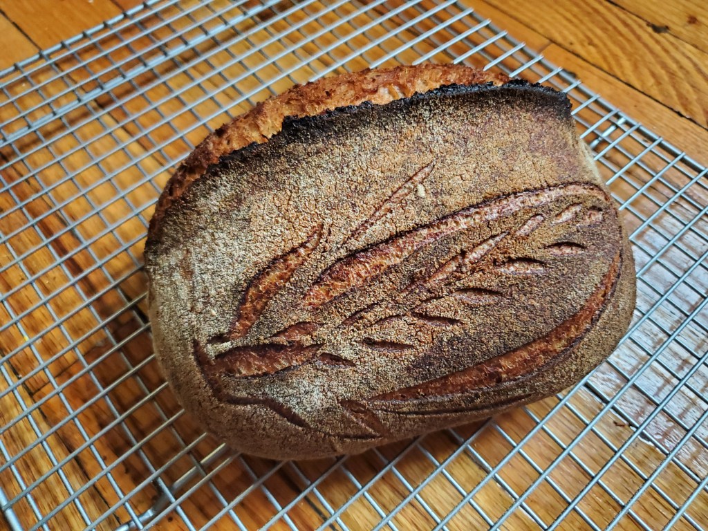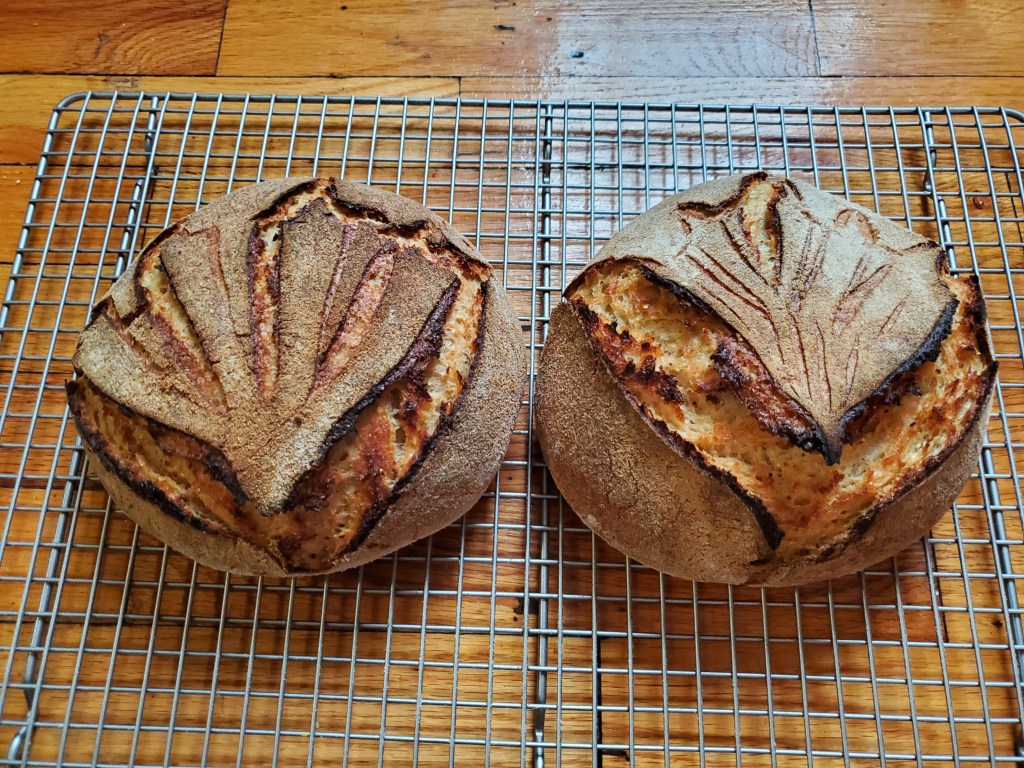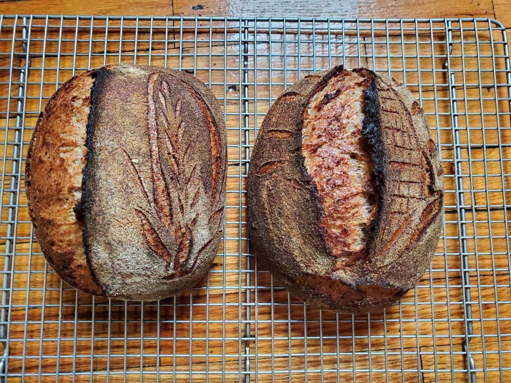 When upon taking the loaves out for baking I was a big concerned about their lack of growth, but carried on with baking them as planned. I scored “red” loaves with ears of corn and the “yellow” loaves with an attempt an Autumn leaf. All four were baked covered at 480F (⍨250C) for 23 minutes and uncovered at 450F (⍨230C) 18-20 minutes. Of note, the yellow loaves seemed to be moist on top after the covered portion of the bake, but I knew that it would evaporate after baking uncovered so I wasn’t too concerned at the time.
