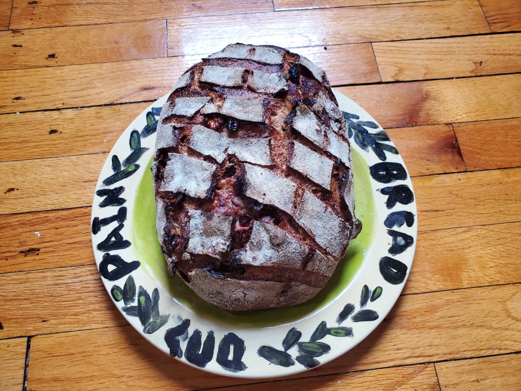 Final Thoughts: Overall these loaves came out looking and tasting great. The whole grain flours, cranberries, and nuts contributed to both great texture and flavor and the orange zest added freshness and complexity. In terms of appearance my scoring decisions (see pictures below) led to differences in oven spring, but thanksfully both loaves had even crumb and a crisp crust. Though I added the honey to balance the tartness of the cranberries and orange zest, all who tried these loaves noted that the orange zest at times seemed overpowering. In turn, next time I bake this recipe I’ll use less orange zest and possibly add some cinnamon to complement the nuts.