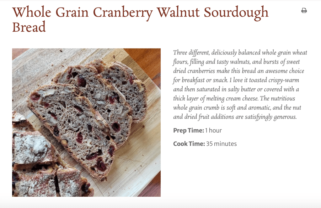 When looking for a cranberry-walnut sourdough loaf recipe I chose Breadtopia’s because of its well tested whole grain element and my familiarity with the technique/s included in its list of preparation instructions. However, I chose to include two ingredients from other recipes that I read during my initial recipe search along with two ingredients that were chosen to put my own personal touch on my adapted recipe. Firstly, I found that many recipes included orange juice in place of some or all of the water and/or orange zest; therefore, I included the zest of one large orange. Secondly, I chose to use both walnuts and pecans instead of only walnuts for added complexity and to embrace my love of toasted pecans in baked goods. Lastly, in terms of my purely personal ingredient choices, I made 10% of the flour freshly milled hard Redeemer wheat berries from Castle ValleyMill in order to take advantage of their natural cinnamon aroma (when milled) and added 9% honey to balance the tartness of the cranberries and orange zest.